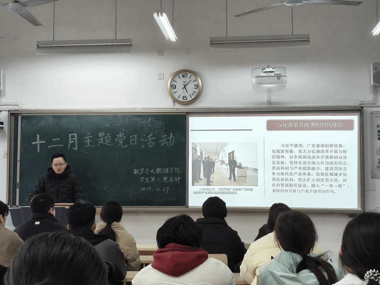 为深入学习贯彻习近平总书记在广东考察时的重要讲话精神,数学与大数据学院各学生党支部于2025年12月29日下午5点整分别在明德楼B105、B106、B108教室召开十二月党日活动,本次会议由各支部书记主持,全体学生党员参加。