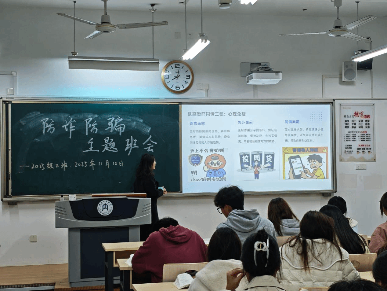 班会中,各班首先结合近期校园周边高发诈骗案例,系统解析电信诈骗、网络刷单、虚假校园贷、冒充亲友等常见诈骗类型,细致剖析诈骗分子利用学生防范意识薄弱、贪图小利等心理实施诈骗的常见套路,并清晰讲解各类骗局的识别要点。随后,班会设置互动问答环节,并组织学生分享防诈常识,通过理论讲解与互动交流结合的方式,防诈知识更加入脑入心。