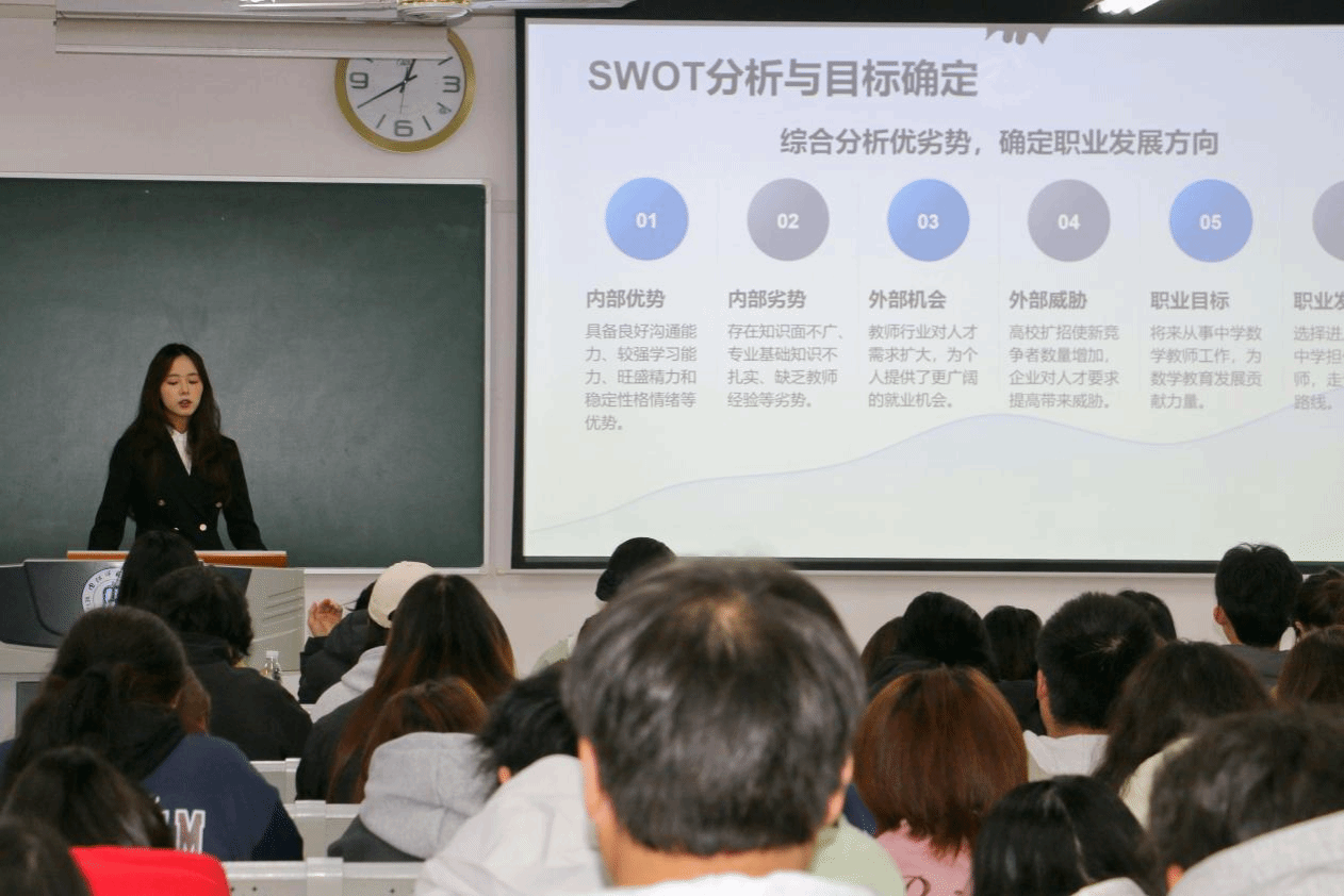 主持人介绍流程后,10名选手依次登台,以演讲内容与PPT深度融合的方式展示职业规划,包含学业目标与职业愿景,彰显学子清晰规划意识与积极风貌。宋秋莹老师总结点评时,肯定了选手自我认知与目标设定的合理性,表扬 2025 级新生的积极参与,同时提出三点改进建议:优化 PPT 排版避免文字过载、提前调试设备规避兼容问题、细化规划落实为具体行动方案。