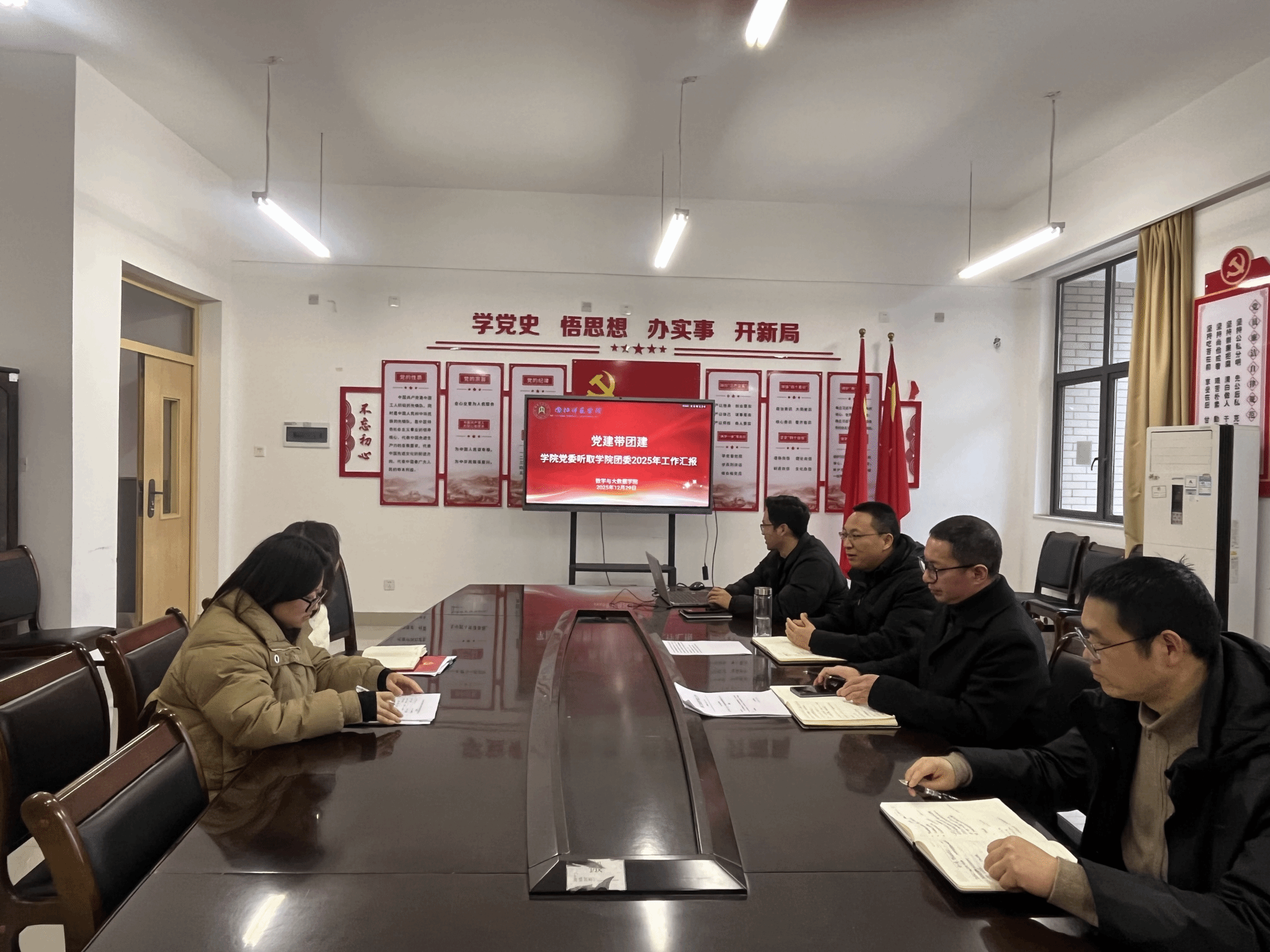 12月29日下午,数学与大数据学院党委召开会议,专题听取学院团委2025年度工作述职。学院党委书记牟廉明及党委委员出席会议,学院团委副书记宋秋莹作工作报告。