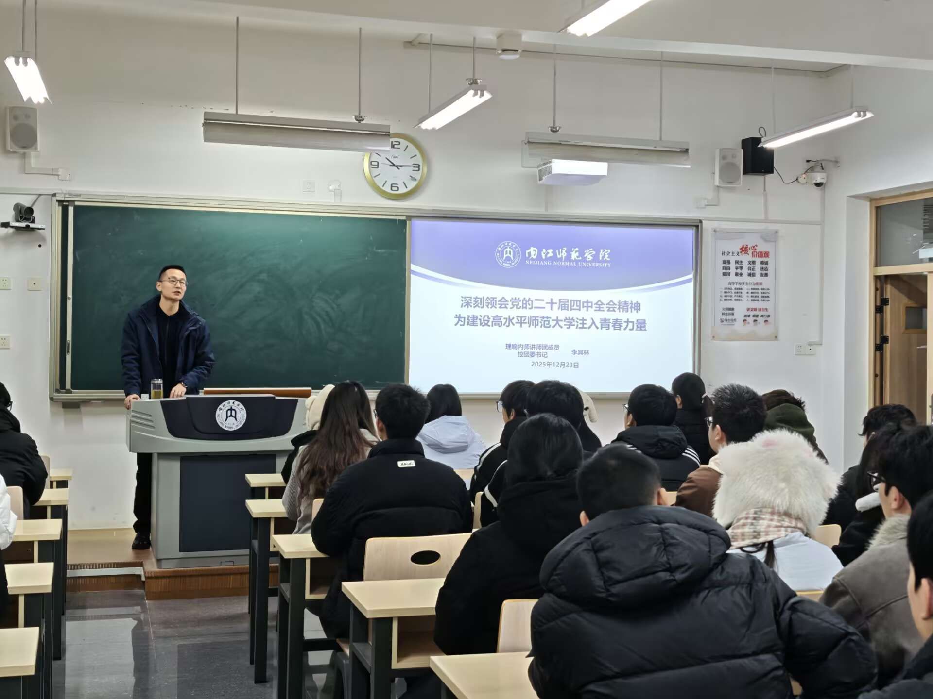 12月23日上午10点20分,校团委书记李其林在明德楼B223教室,为数学与大数据学院师生作了题为《深刻领会党的二十届四中全会精神 勇担新时代使命 为建设高水平师范大学注入青春力量》的主题宣讲。